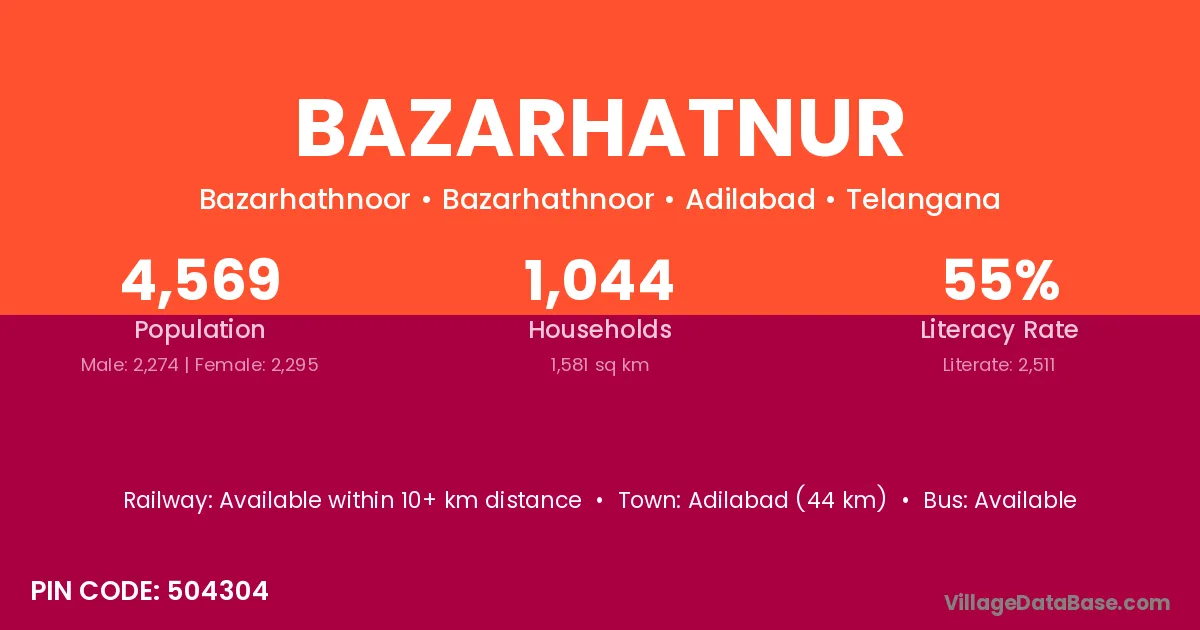Adilabad (44 km) is the nearest town to Bazarhatnur village for major economic activities and is located approximately 44 km away.