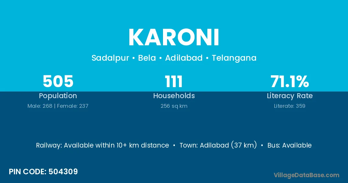Adilabad (37 km) is the nearest town to Karoni village for major economic activities and is located approximately 37 km away.