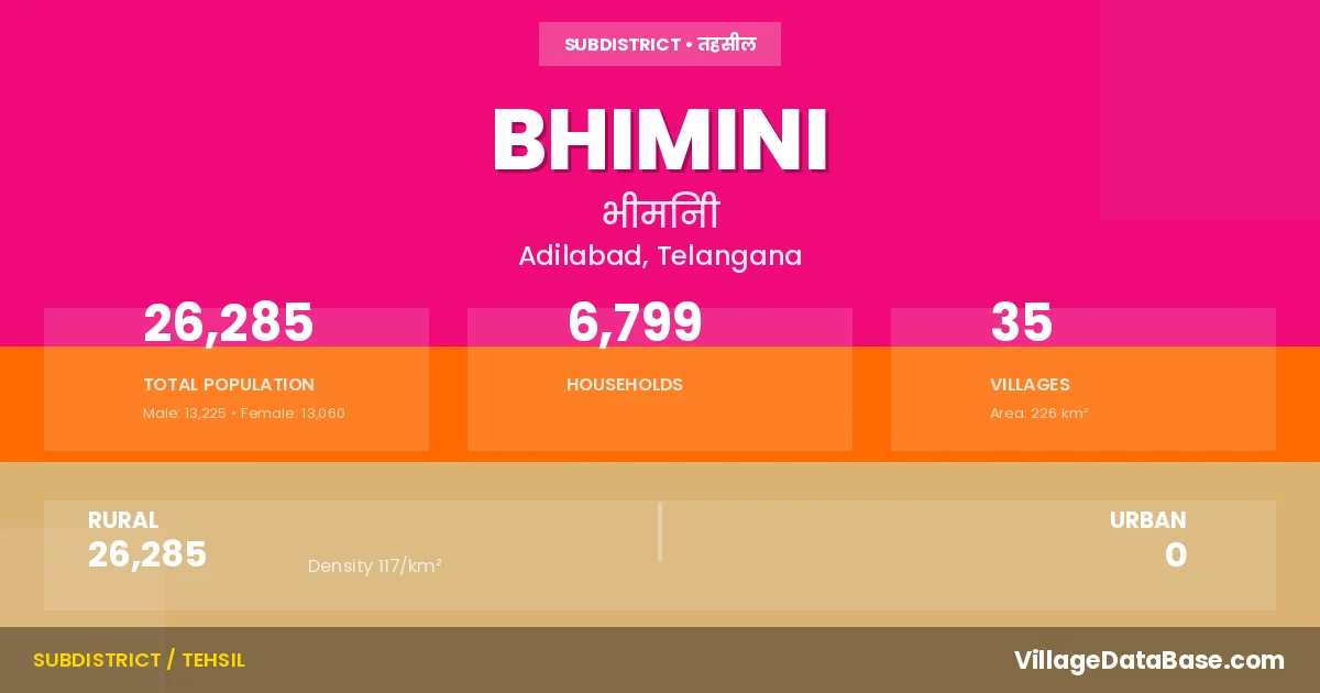 According to the 2011 census The total area of Bhimini Mandal is 226 km², with a population of 26285 people. The population density is 117 inhabitants per square kilometre, and there are approximately 6799 houses in the sub district.