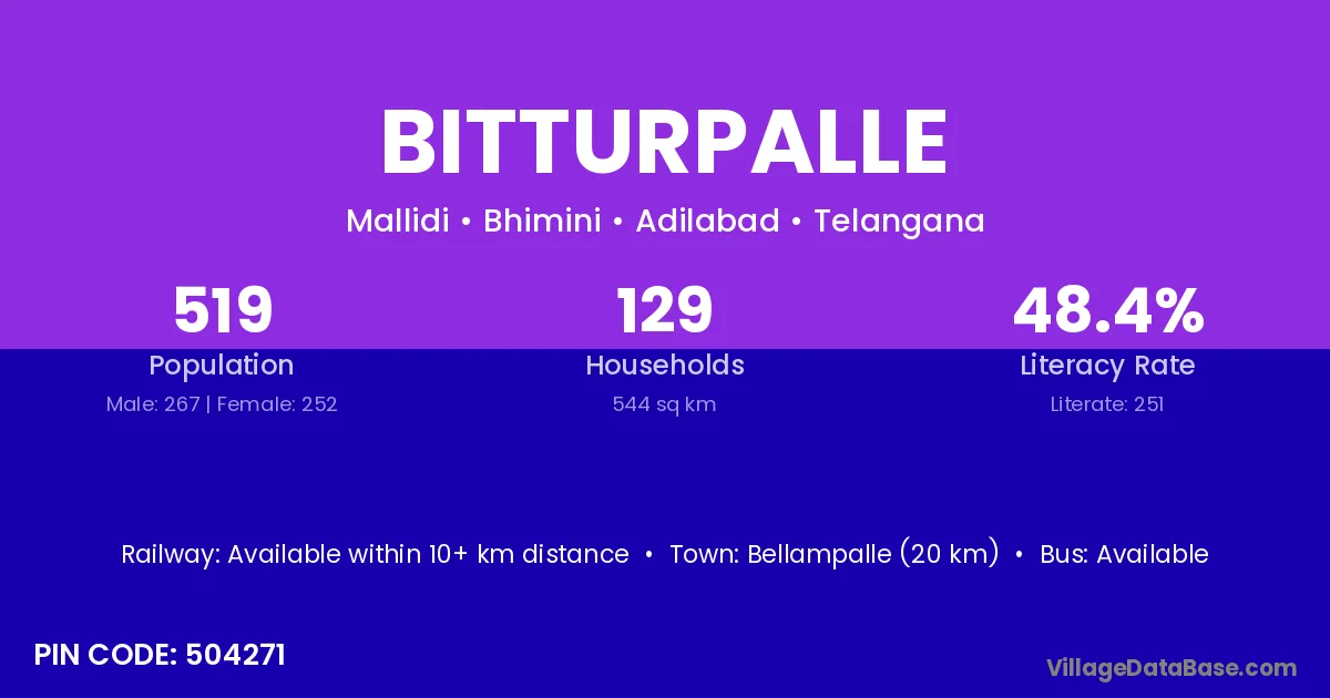 Bellampalle (20 km) is the nearest town to Bitturpalle village for major economic activities and is located approximately 20 km away.