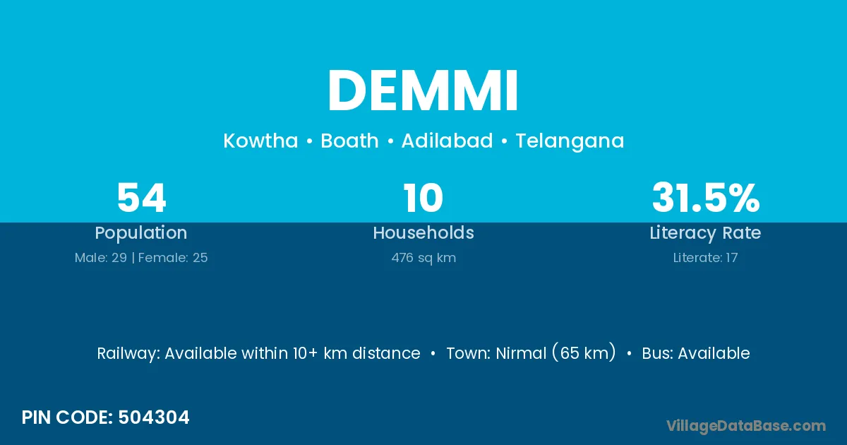 Nirmal (65 km) is the nearest town to Demmi village for major economic activities and is located approximately 65 km away.