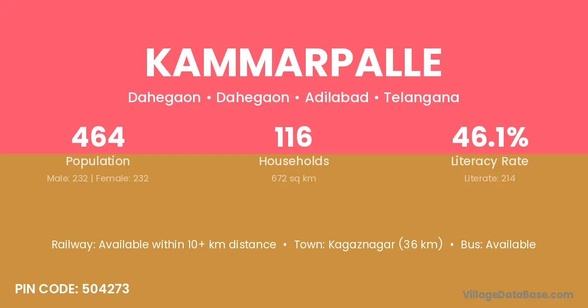 Kammarpalle village has a total population of 464 people, of which 232 are males and 232 are females.