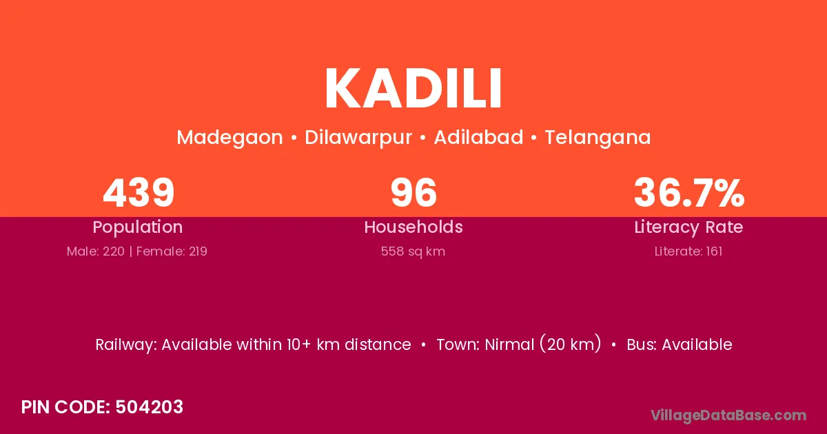 Nirmal (20 km) is the nearest town to Kadili village for major economic activities and is located approximately 20 km away.