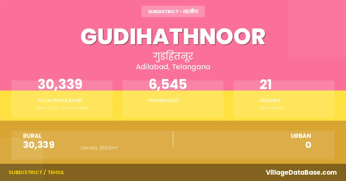 According to the 2011 census The total area of Gudihathnoor Mandal is 151 km², with a population of 30339 people. The population density is 202 inhabitants per square kilometre, and there are approximately 6545 houses in the sub district.