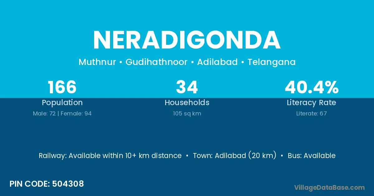 Adilabad (20 km) is the nearest town to Neradigonda village for major economic activities and is located approximately 20 km away.