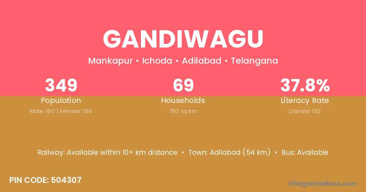 Adilabad (54 km) is the nearest town to Gandiwagu village for major economic activities and is located approximately 54 km away.