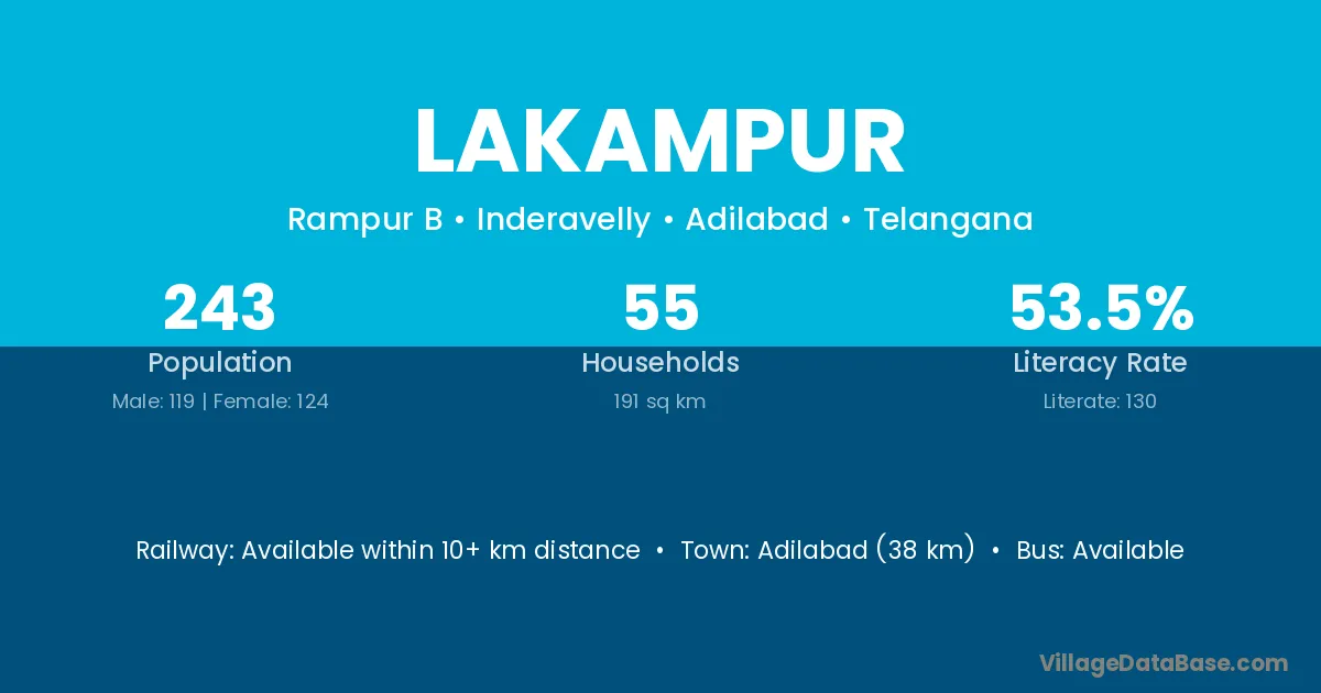 Adilabad (38 km) is the nearest town to Lakampur village for major economic activities and is located approximately 38 km away.