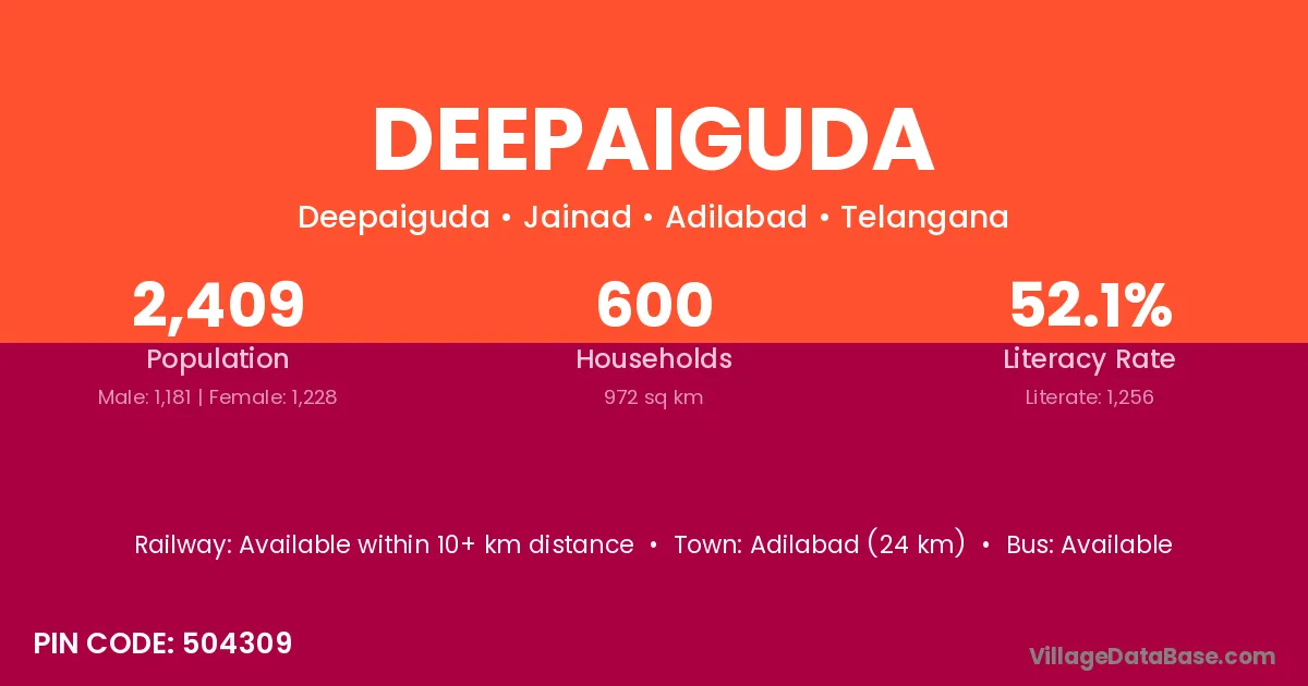 Adilabad (24 km) is the nearest town to Deepaiguda village for major economic activities and is located approximately 24 km away.