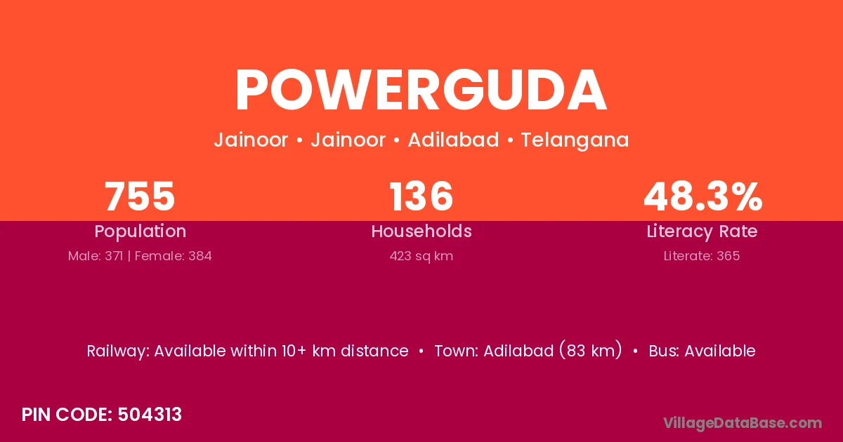 Adilabad (83 km) is the nearest town to Powerguda village for major economic activities and is located approximately 83 km away.