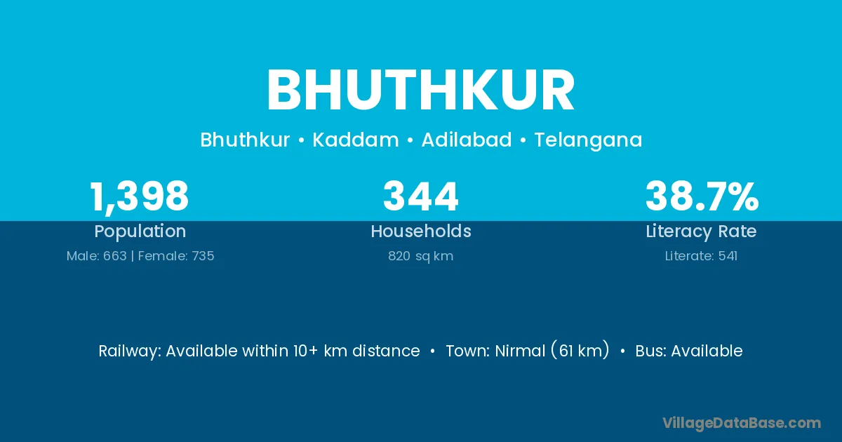 Nirmal (61 km) is the nearest town to Bhuthkur village for major economic activities and is located approximately 61 km away.