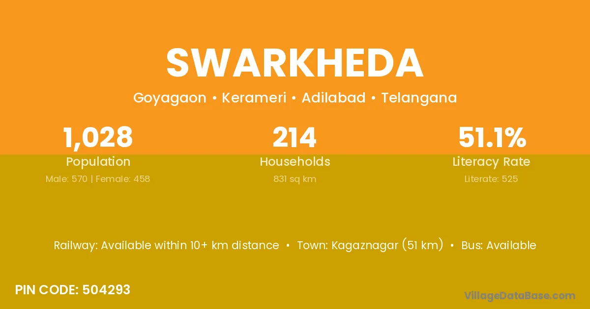 Kagaznagar (51 km) is the nearest town to Swarkheda village for major economic activities and is located approximately 51 km away.