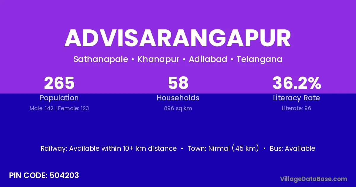 Nirmal (45 km) is the nearest town to Advisarangapur village for major economic activities and is located approximately 45 km away.