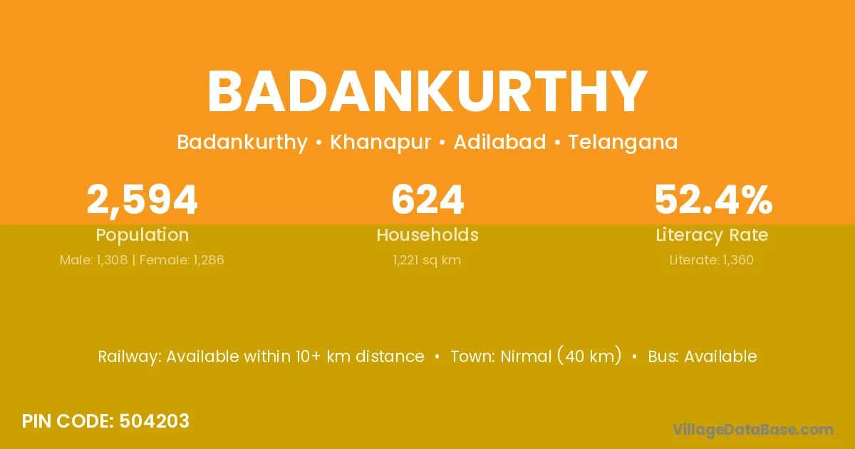 Nirmal (40 km) is the nearest town to Badankurthy village for major economic activities and is located approximately 40 km away.