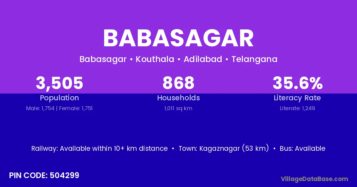 Kagaznagar (53 km) is the nearest town to Babasagar village for major economic activities and is located approximately 53 km away.
