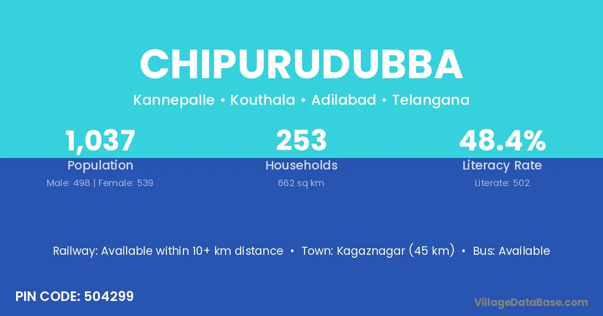 Kagaznagar (45 km) is the nearest town to Chipurudubba village for major economic activities and is located approximately 45 km away.