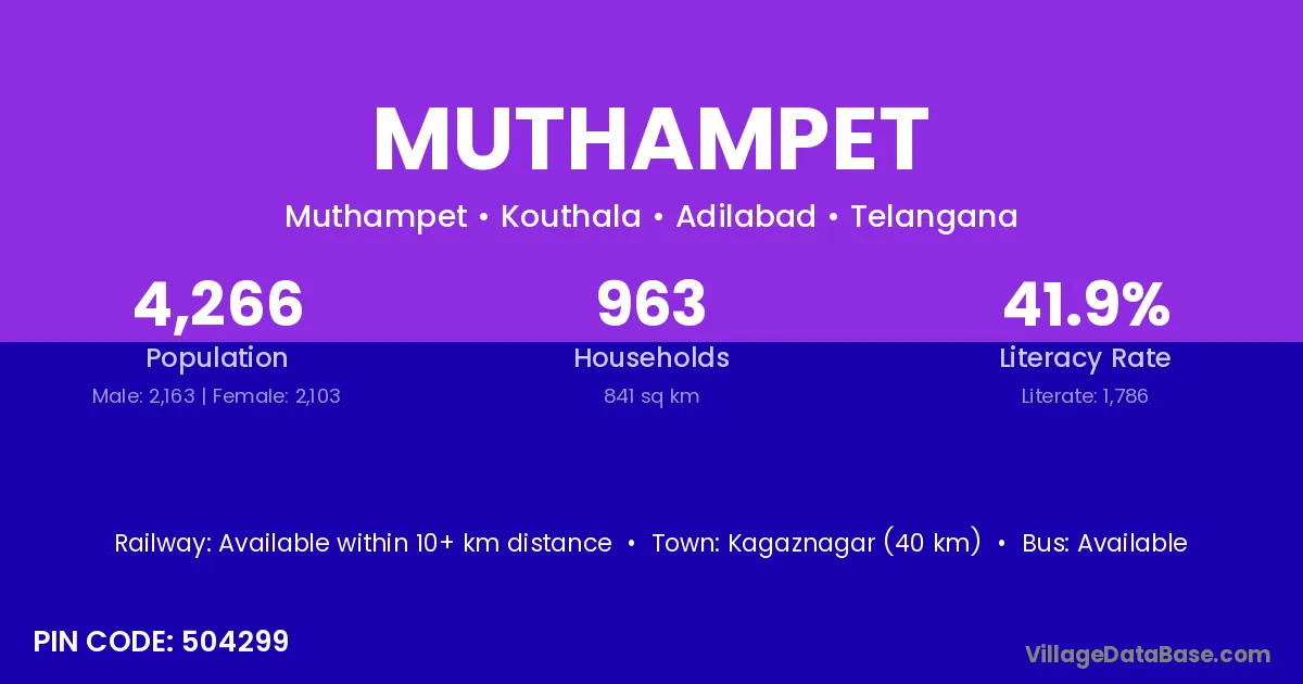 Kagaznagar (40 km) is the nearest town to Muthampet village for major economic activities and is located approximately 40 km away.