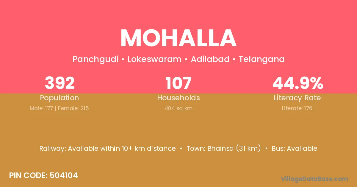 According to Census 2011 information, the village code of Mohalla village is 504104.