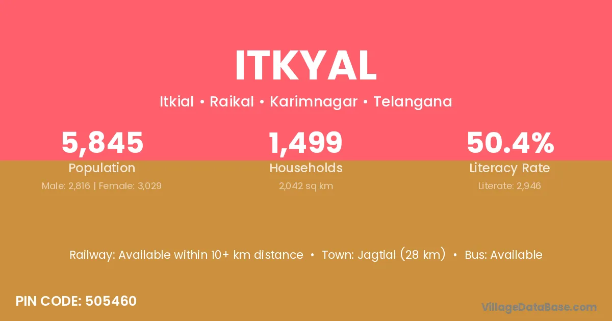 Mancherial (30 km) is the nearest town to Itkyal village for major economic activities and is located approximately 30 km away.