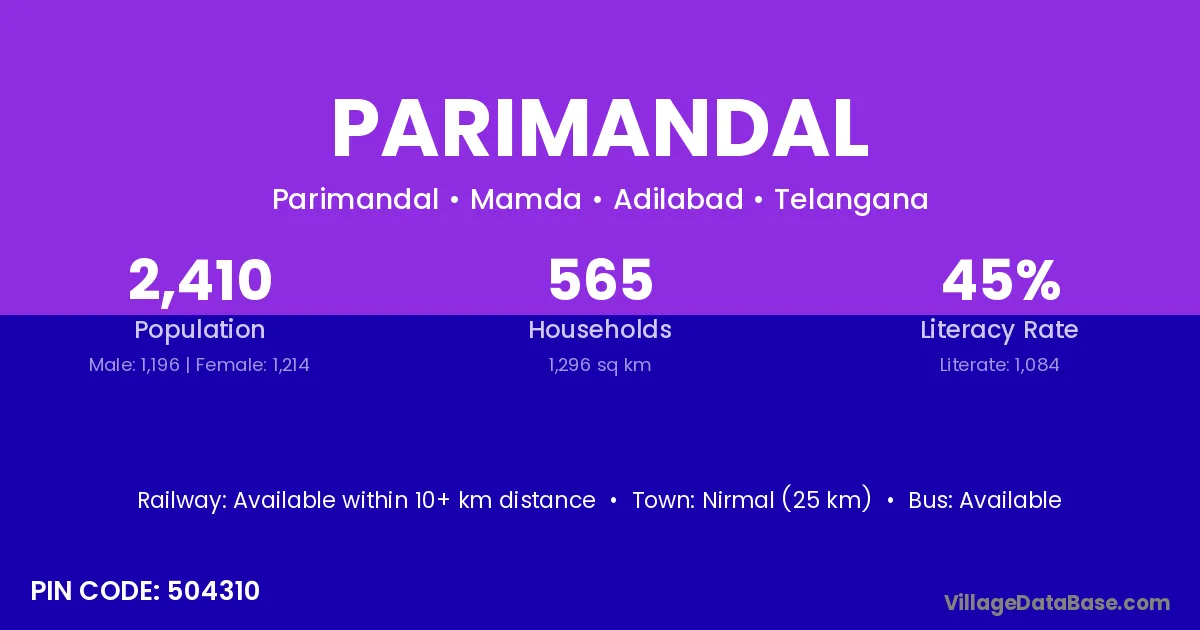 Nirmal (25 km) is the nearest town to Parimandal village for major economic activities and is located approximately 25 km away.