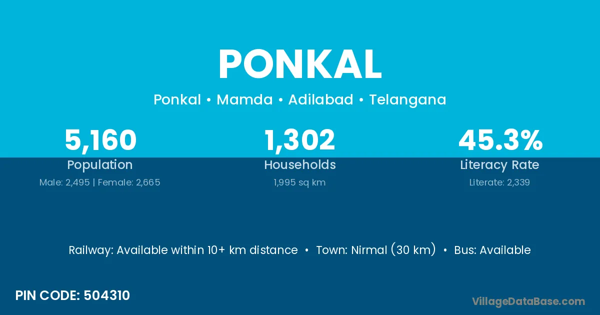 Nirmal (30 km) is the nearest town to Ponkal village for major economic activities and is located approximately 30 km away.