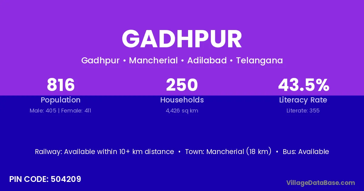Mancherial (18 km) is the nearest town to Gadhpur village for major economic activities and is located approximately 18 km away.