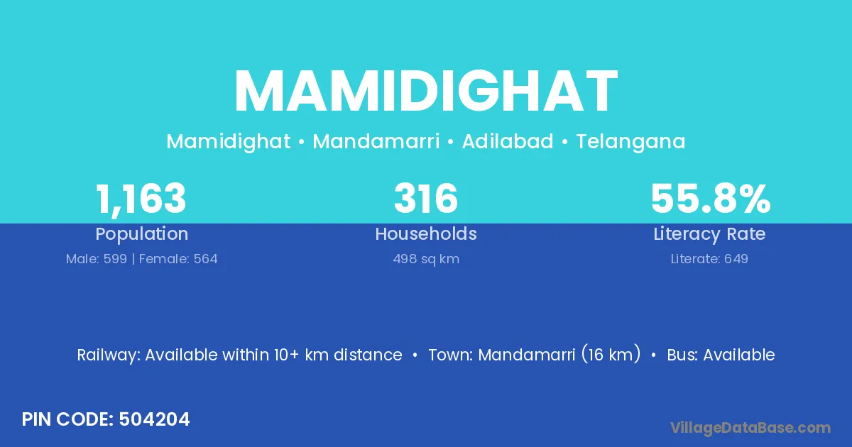 Mandamarri (16 km) is the nearest town to Mamidighat village for major economic activities and is located approximately 16 km away.
