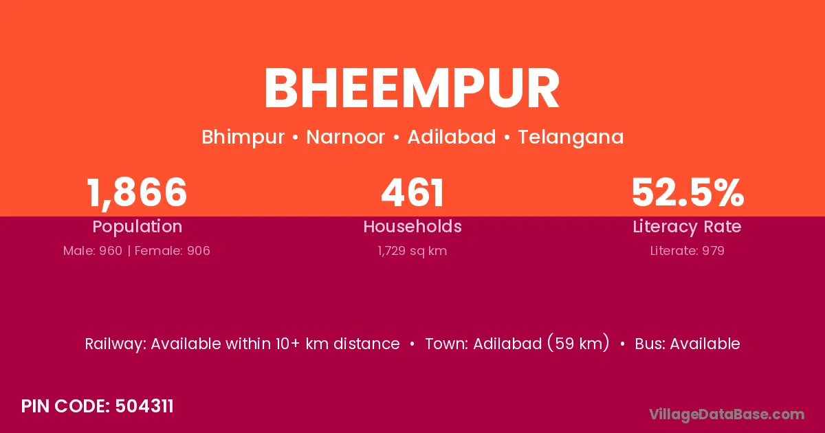 Adilabad (59 km) is the nearest town to Bheempur village for major economic activities and is located approximately 59 km away.