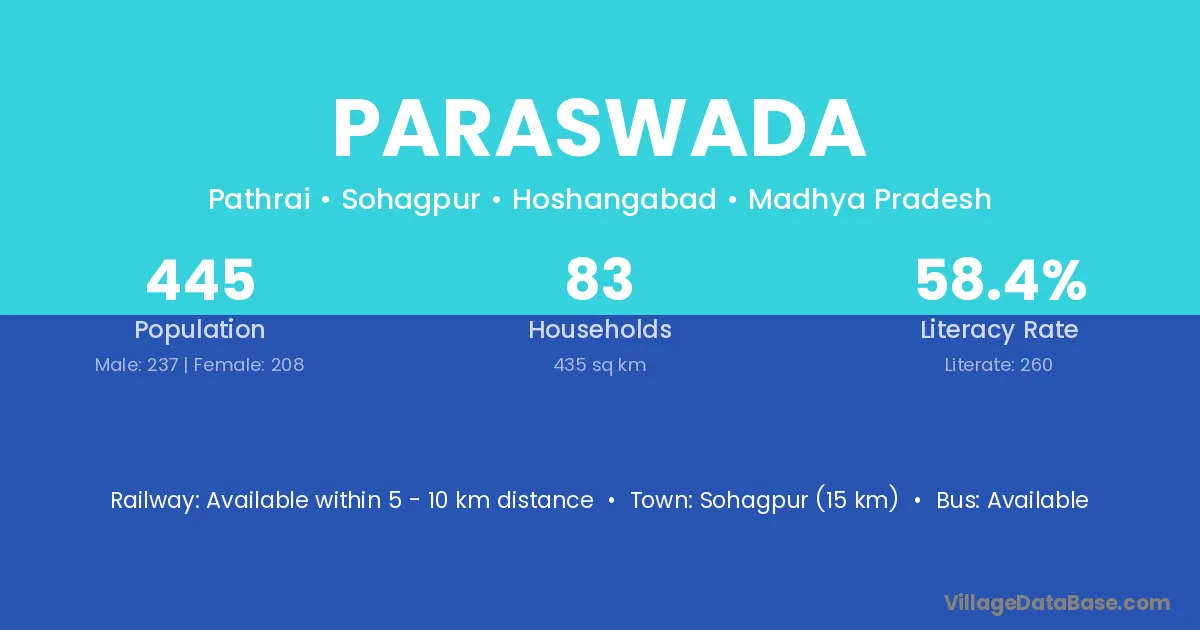 Adilabad (12 km) is the nearest town to Paraswada village for major economic activities and is located approximately 12 km away.