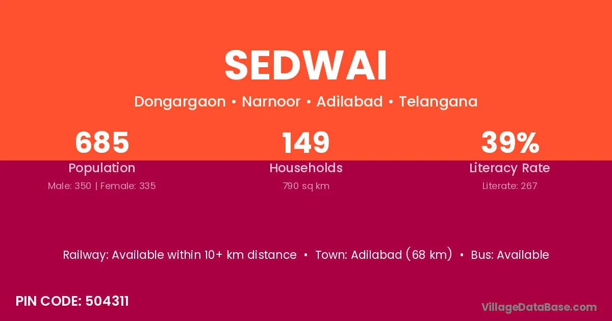 Adilabad (68 km) is the nearest town to Sedwai village for major economic activities and is located approximately 68 km away.