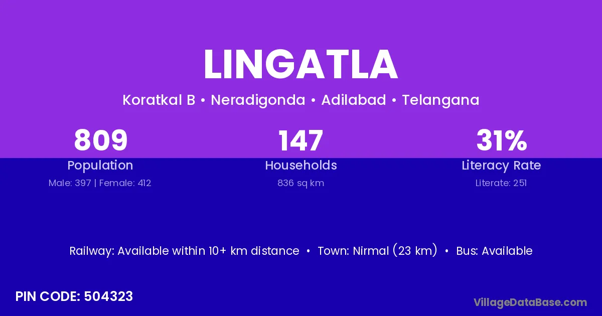 Nirmal (23 km) is the nearest town to Lingatla village for major economic activities and is located approximately 23 km away.