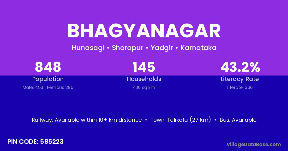 The literacy rate of Bhagyanagar village is 42.03%. Male literacy stands at 50.20% and female literacy at 34.64%.