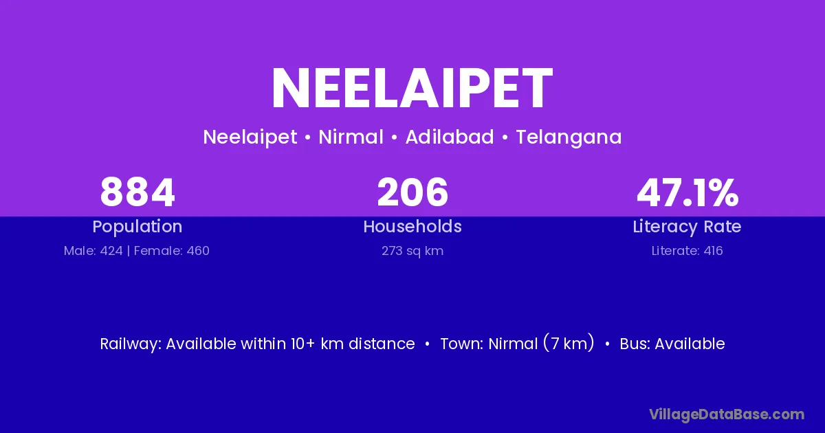 Nirmal (7 km) is the nearest town to Neelaipet village for major economic activities and is located approximately 7 km away.