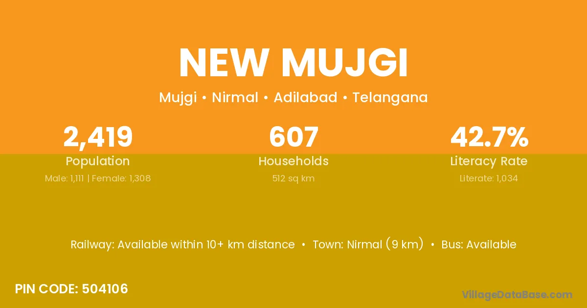 Nirmal (9 km) is the nearest town to New Mujgi village for major economic activities and is located approximately 9 km away.