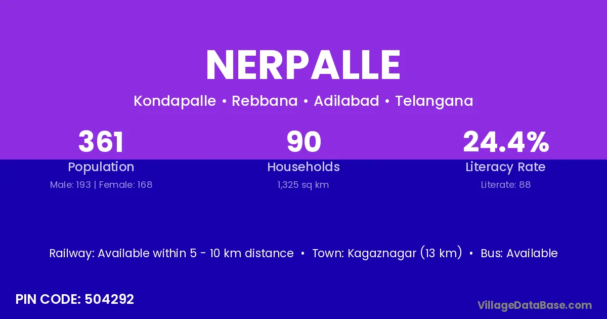 Kagaznagar (13 km) is the nearest town to Nerpalle village for major economic activities and is located approximately 13 km away.