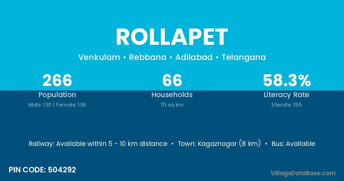 Kagaznagar (8 km) is the nearest town to Rollapet village for major economic activities and is located approximately 8 km away.