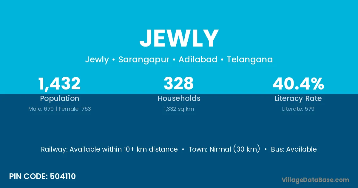 Nirmal (30 km) is the nearest town to Jewly village for major economic activities and is located approximately 30 km away.