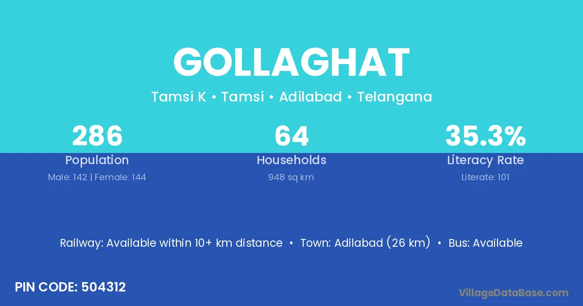 Adilabad (26 km) is the nearest town to Gollaghat village for major economic activities and is located approximately 26 km away.