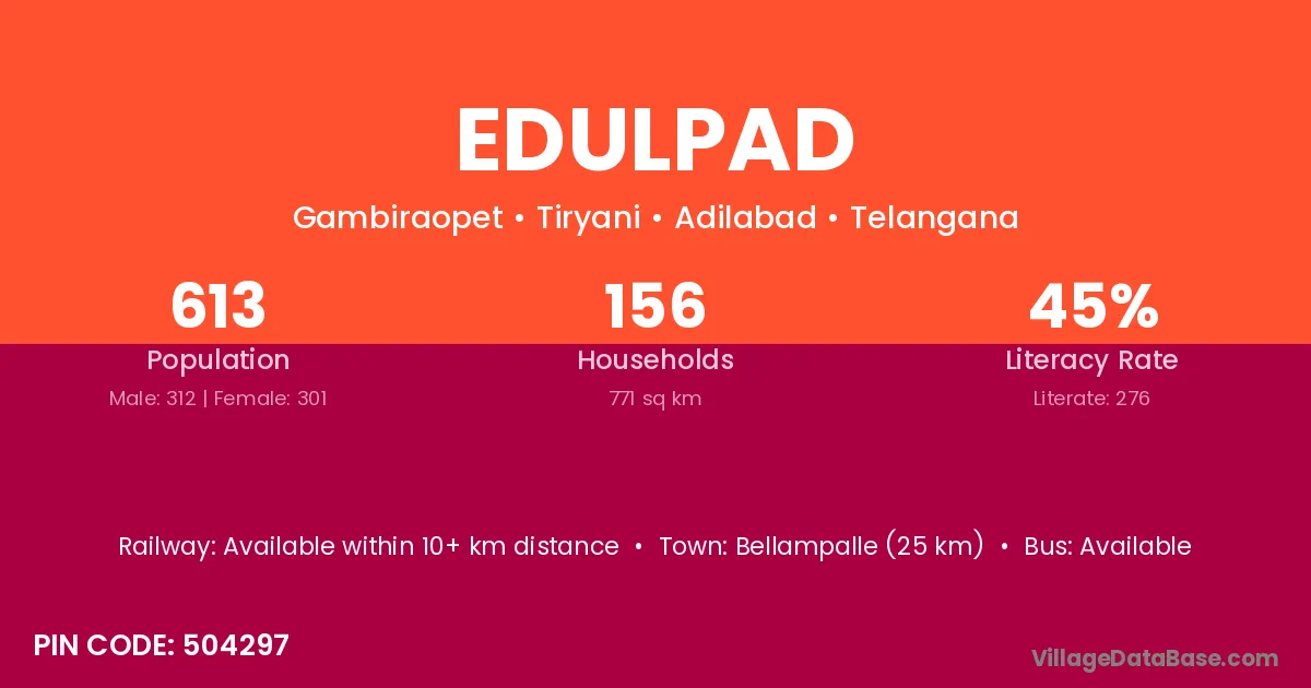 Bellampalle (25 km) is the nearest town to Edulpad village for major economic activities and is located approximately 25 km away.