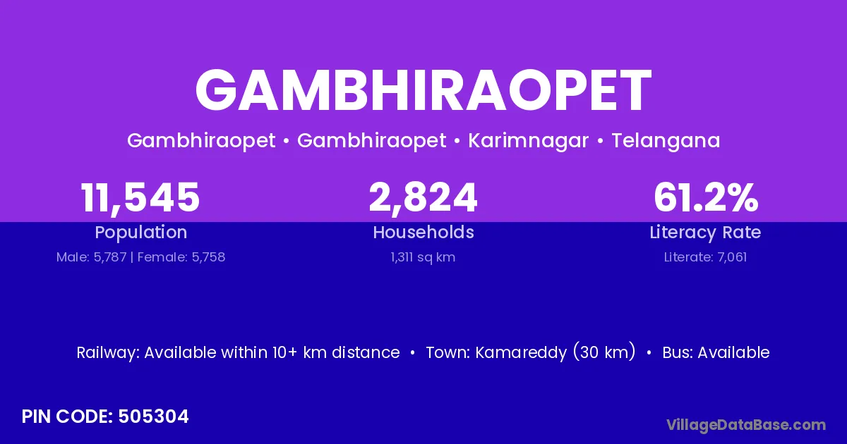 Bellampalle (20 km) is the nearest town to Gambhiraopet village for major economic activities and is located approximately 20 km away.