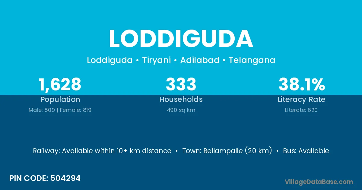 Bellampalle (20 km) is the nearest town to Loddiguda village for major economic activities and is located approximately 20 km away.