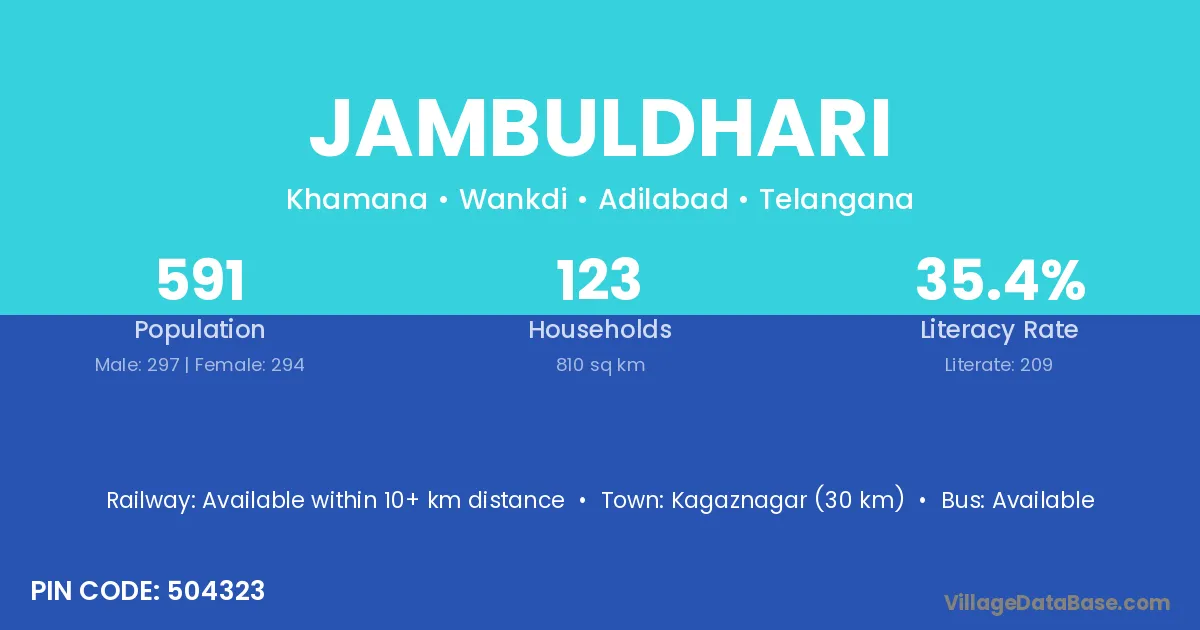 Kagaznagar (30 km) is the nearest town to Jambuldhari village for major economic activities and is located approximately 30 km away.