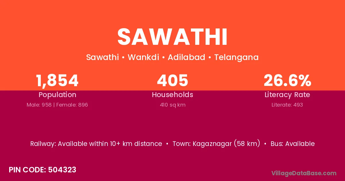 Kagaznagar (58 km) is the nearest town to Sawathi village for major economic activities and is located approximately 58 km away.