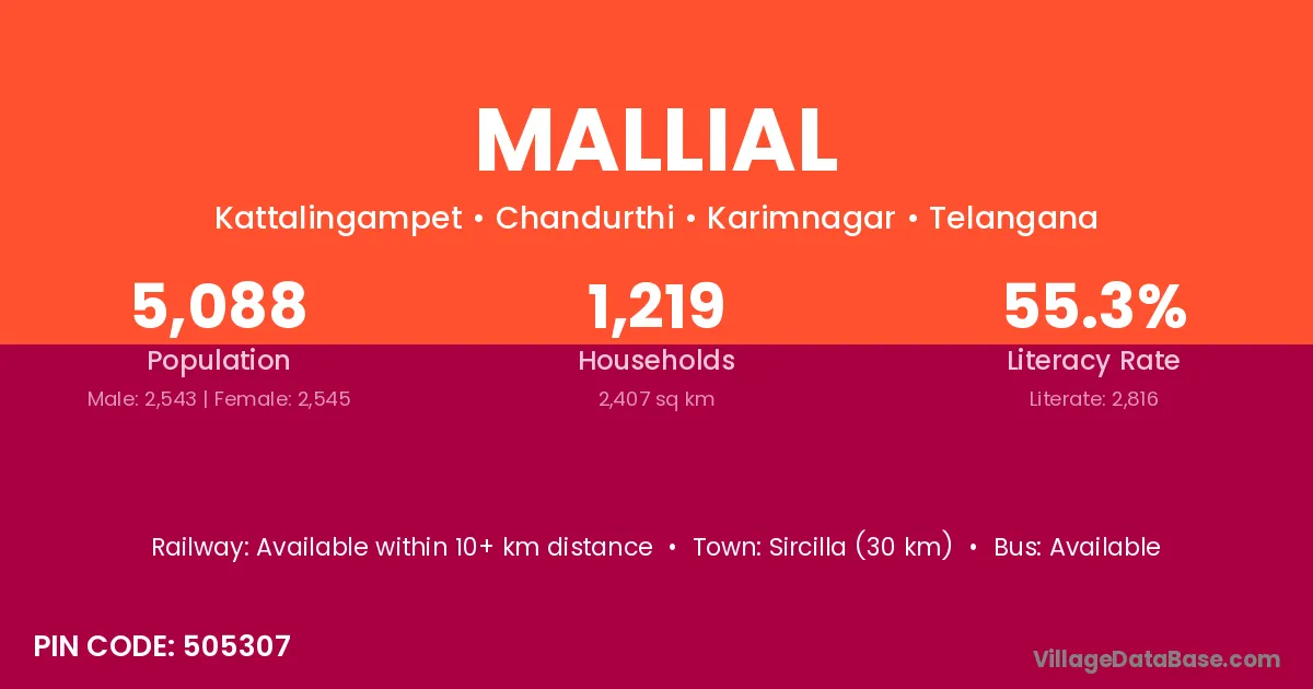 Sircilla (30 km) is the nearest town to Mallial village for major economic activities and is located approximately 30 km away.