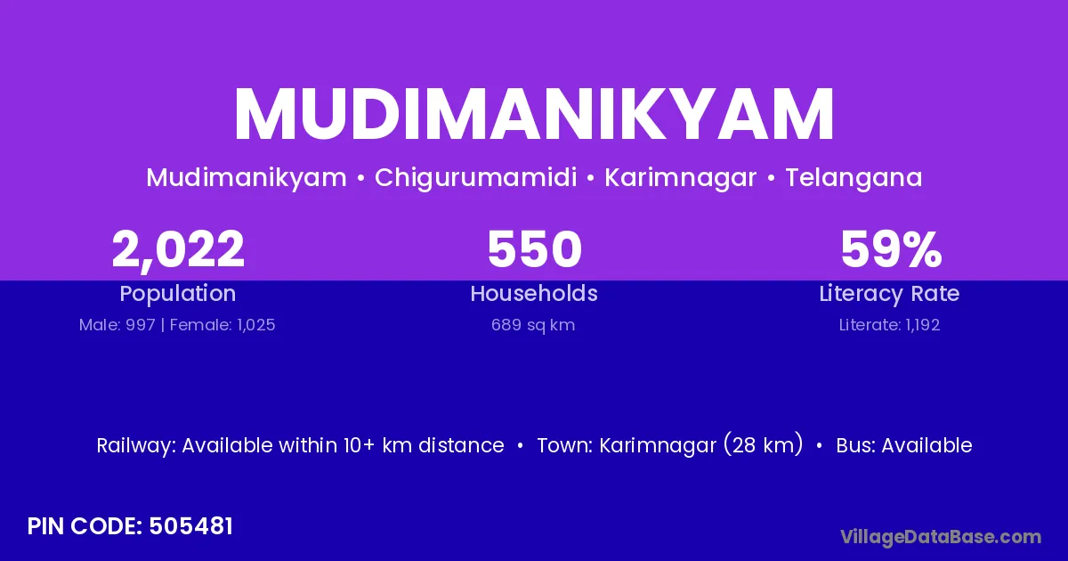 Mudimanikyam village has a total population of 2,022 people, of which 997 are males and 1,025 are females.