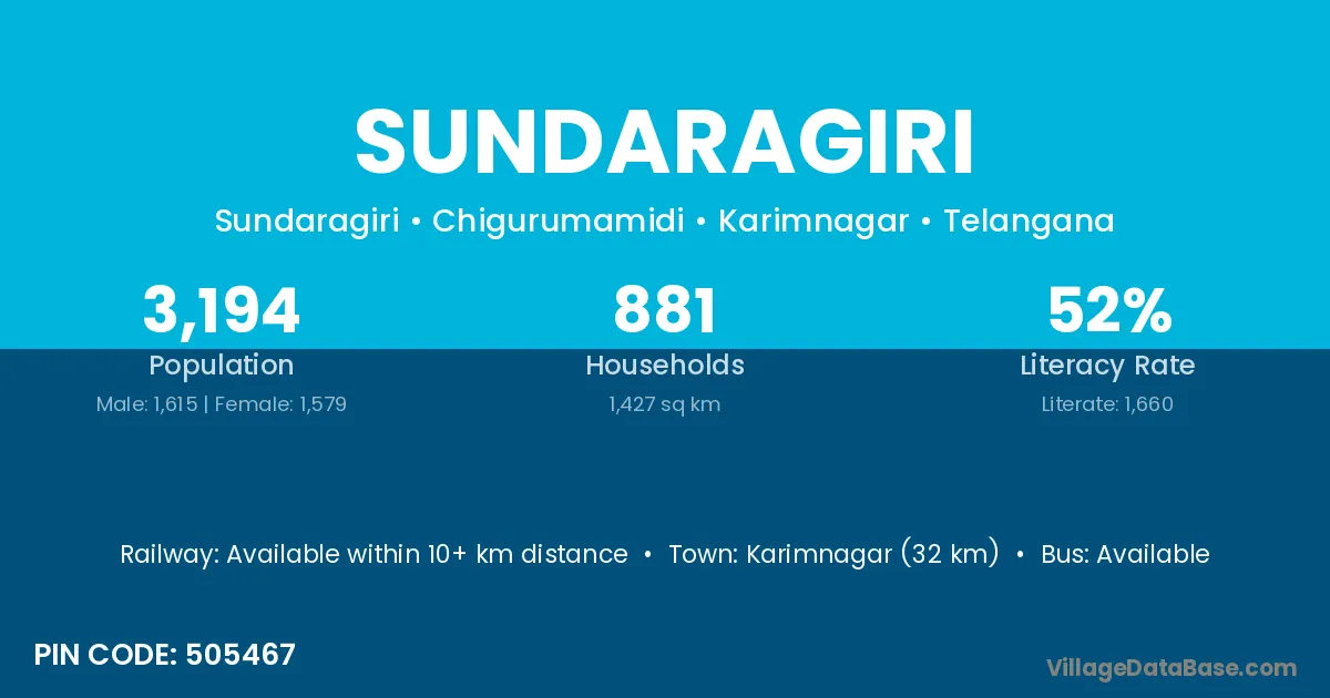 Karimnagar (32 km) is the nearest town to Sundaragiri village for major economic activities and is located approximately 32 km away.