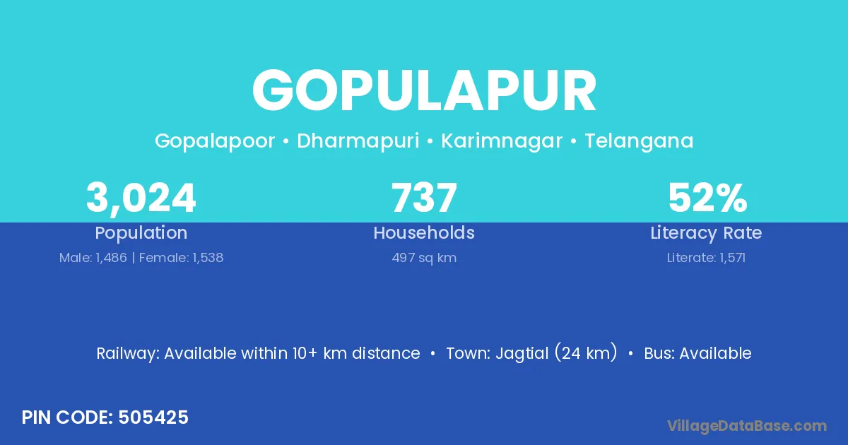 Jagtial (24 km) is the nearest town to Gopulapur village for major economic activities and is located approximately 24 km away.