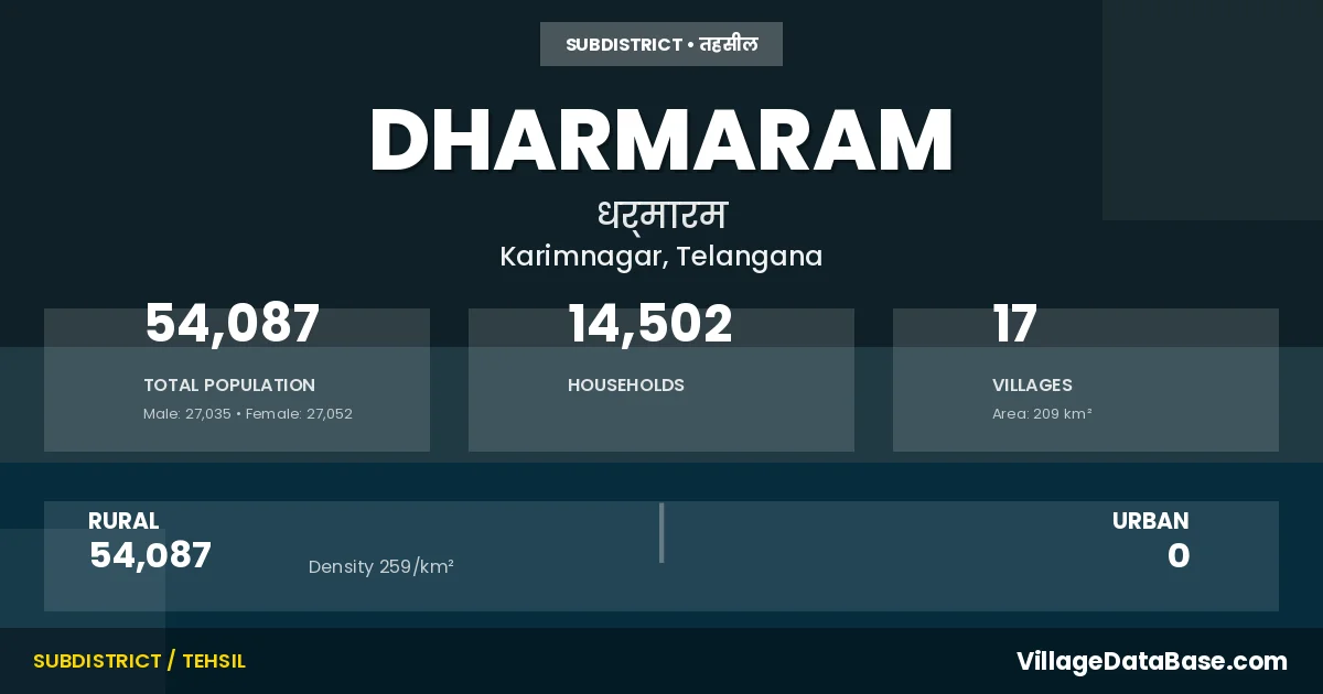 According to the 2011 census The total area of Dharmaram Mandal is 209 km², with a population of 54087 people. The population density is 259 inhabitants per square kilometre, and there are approximately 14502 houses in the sub district.