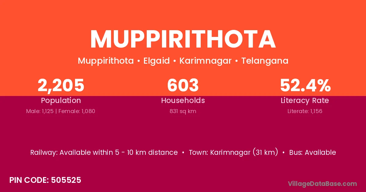Karimnagar (31 km) is the nearest town to Muppirithota village for major economic activities and is located approximately 31 km away.