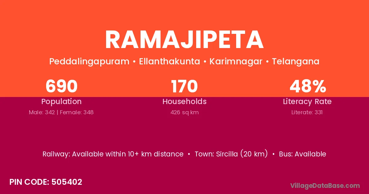 Sircilla (20 km) is the nearest town to Ramajipeta village for major economic activities and is located approximately 20 km away.