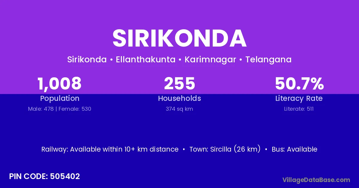 Sircilla (26 km) is the nearest town to Sirikonda village for major economic activities and is located approximately 26 km away.